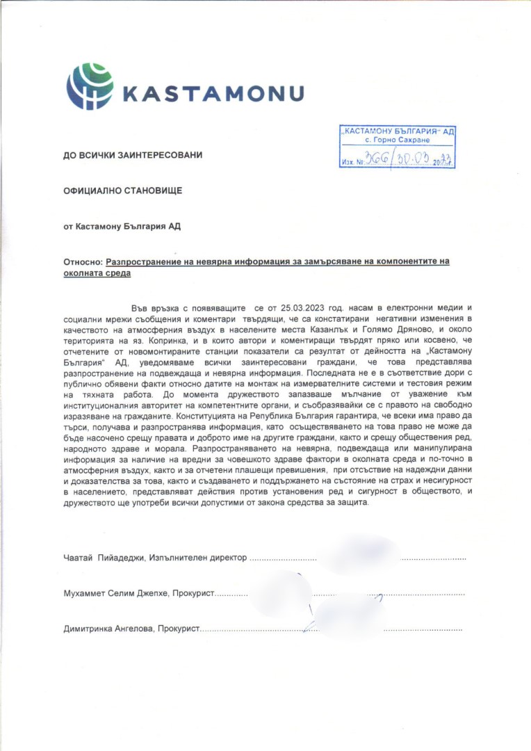 „Във връзка с появяващите се от 25.03.2023 г. насам в електронни медии и социални мрежи съобщения и коментари твърдящи, че са констатирани негативни изменения в качеството на атмосферния въздух в населените места Казанлък и Голямо Дряново, и около територията на язовир Копринка, и в които автори и коментиращи твърдят пряко или косвено, че отчетените от новомонтираните станции показатели са резултат от дейността на „Кастамону България” АД, уведомяваме всички заинтересовани граждани, че това представлява разпространение на невярна информация.