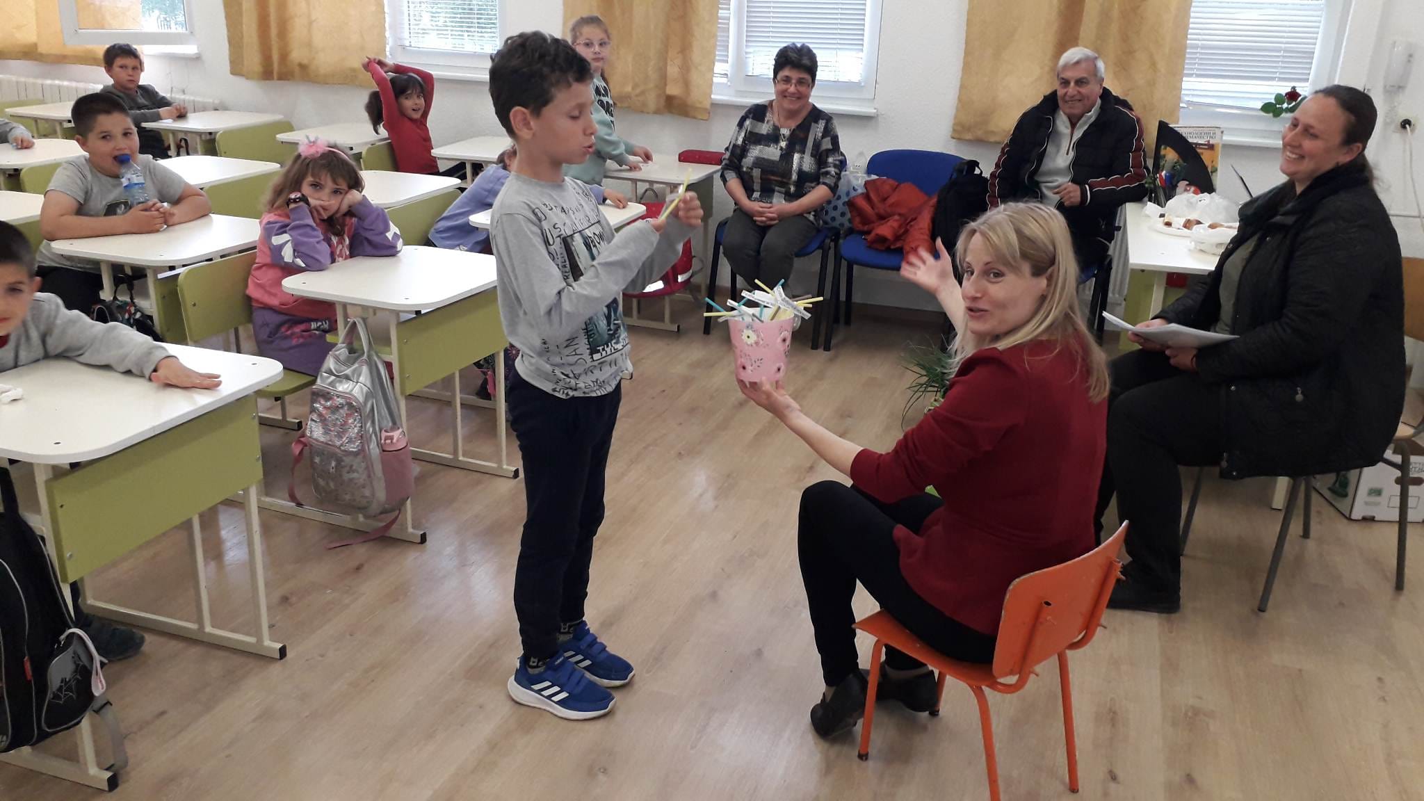 С най-мили пожелания към възрастните хора, потребители на Домашен социален патронаж, учениците от 1б клас и г-жа Таня Пъкова от ОУ "Св. Паисий Хилендарски" поднесоха своите дарове - пролетни зеленчуци, отгледани лично от тях в учебната зеленчукова градина.