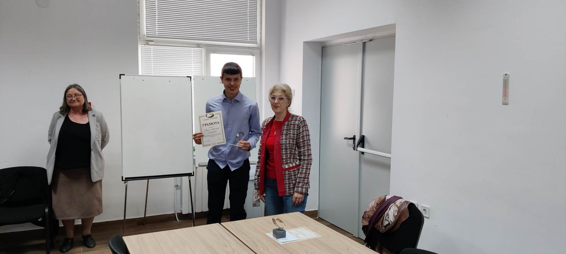 През тази година отличените са Никола Р. Димитров и г-жа Цветанка Савова. Никола не само завършва като пълен отличник математическата гимназия, но е с престижна награда за своя проект, съчетаващ математика и информатика, от 52-та Национална конференция на УчИМИ към Българската академия на науката. Освен това е и участник с достойно представяне на националния кръг на олимпиадата по философия. С тези си постижения дванайсетокласникът продължава традициите на успеха на казанлъшката математическа гимназия.