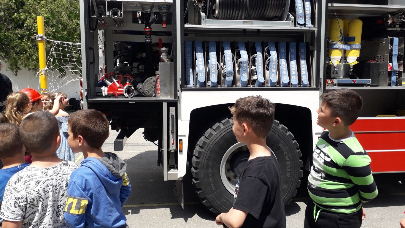 Изключителен интерес предизвика пожарната кола. След като имаха възможност да я разгледат отблизо, учениците взеха участие и в тренировъчно действие по пренасяне на пострадал.