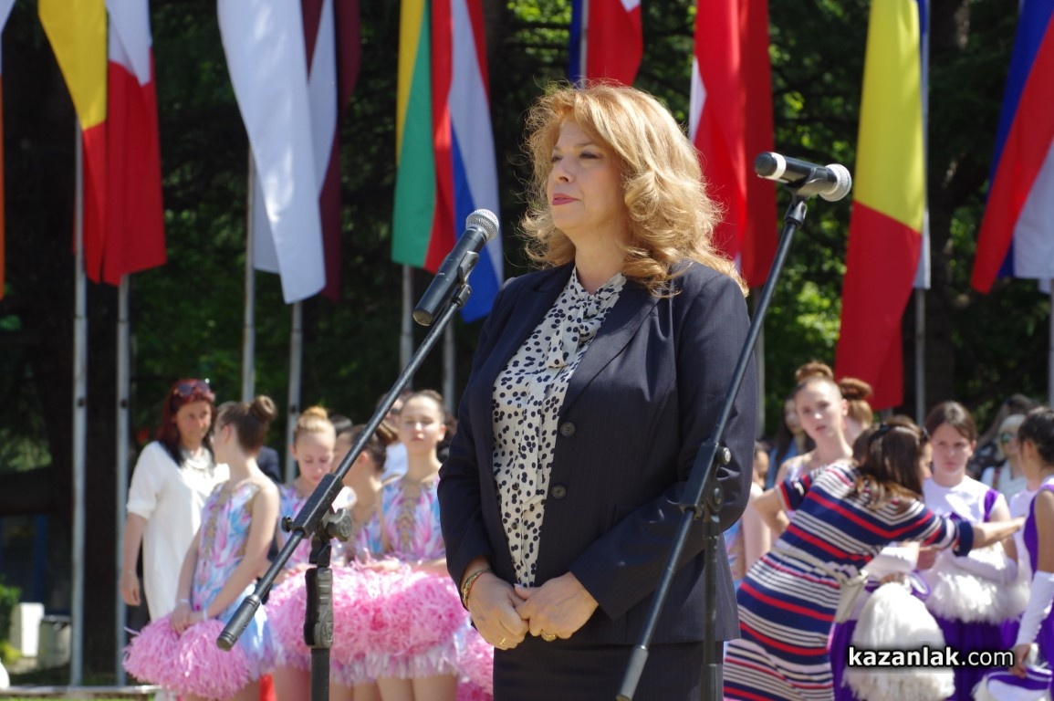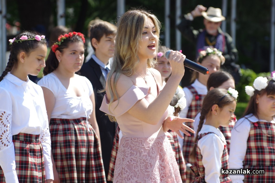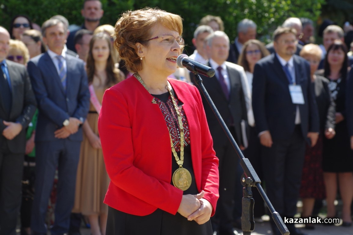 Кметът на Община Казанлък поздрави жителите и гостите на града за празника и напомни, че безпристрастната научна оценка отреждат дълголетието на българската култура: „Несломимият български дух е резултат на българския език, българската писменост и българската култура, опазени и съхранени през вековете.“, заяви Галина Стоянова. „Нещо повече, те са станали люлка и на европейската култура и цивилизация.“, посочи тя и отбеляза, че „Този дух е изграждан от самочувствие, формирано от знания и с него те не само са отстоявали своите земи от различни нашественици, но са ги и разширявали, без да проливат дори капка кръв.“. Кметът на Казанлък обърна внимание, че „Самочувствието на българина идва със знанието.“. Тя отдаде почит на предците ни: „Несломимите траки, славяни, прабългари, възрожденците, Петьо Ганин, д-р Стаболски, ученолюбивата дружина „Искра“, бойните редици на 23 Пехотен шипченски полк, Ненко Балкански, Иван Милев, академик Петко Стайнов, Чудомир, Дечко Узунов, Емануил Манолов. „Щастливи казанлъчани сме, какво повече да иска човек от това да осъзнава, че е част от една общност – казанлъшката!“, възкликна Галина Стоянова. „Трябва да имаш сърце, за да виши, че Казанлък свети като диамант върху короната на Отечеството ни и е пример за подражание!“, заяви Кметът на Казанлък.