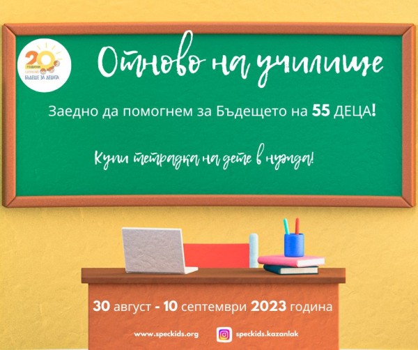 Даренията в рамките на благотворителната инициатива „Отново на училище“ ще се събират от 30.08.2023 г. до 10.09.2023 г., в сградата на КСУДС – гр. Казанлък, ул. „Войнишка“ 25, и ще бъдат раздадени на деца и семейства, с които екипът на организацията работи и подкрепя в Комплексите за социални услуги – Център за обществена подкрепа и Център за социална рехабилитация и интеграция – в град Казанлък.
