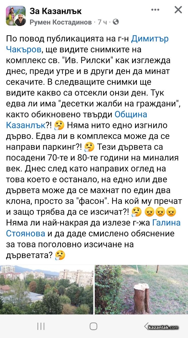 Вчера, публикация в социалната мрежа за отсечени дървета в района на ОДК „Св. Иван Рилски“ предизвика вълна от възмущения и остри коментари по адрес на служителите от Община Казанлък. За сечта алармира Румен Костадинов, който в последствие си изтри поста.