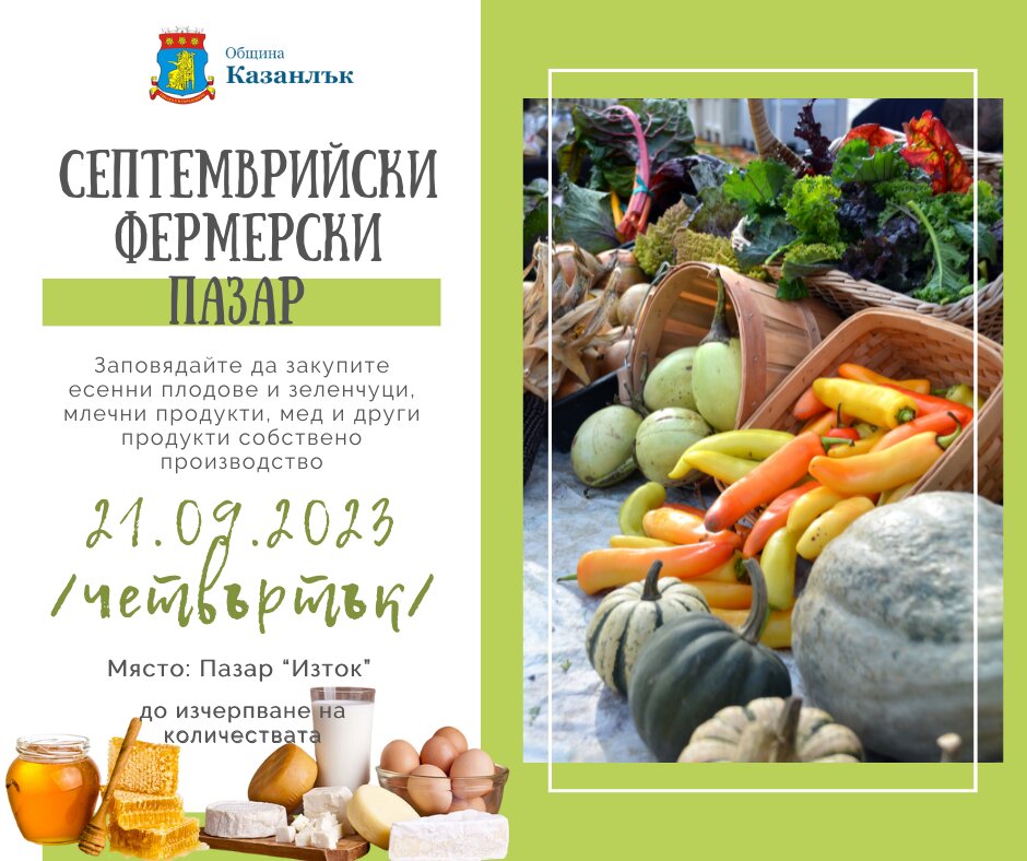 Община Казанлък организира за пети пореден път Фермерски пазар на 21.09.2023 г. /четвъртък/ до изчерпване на продукцията.