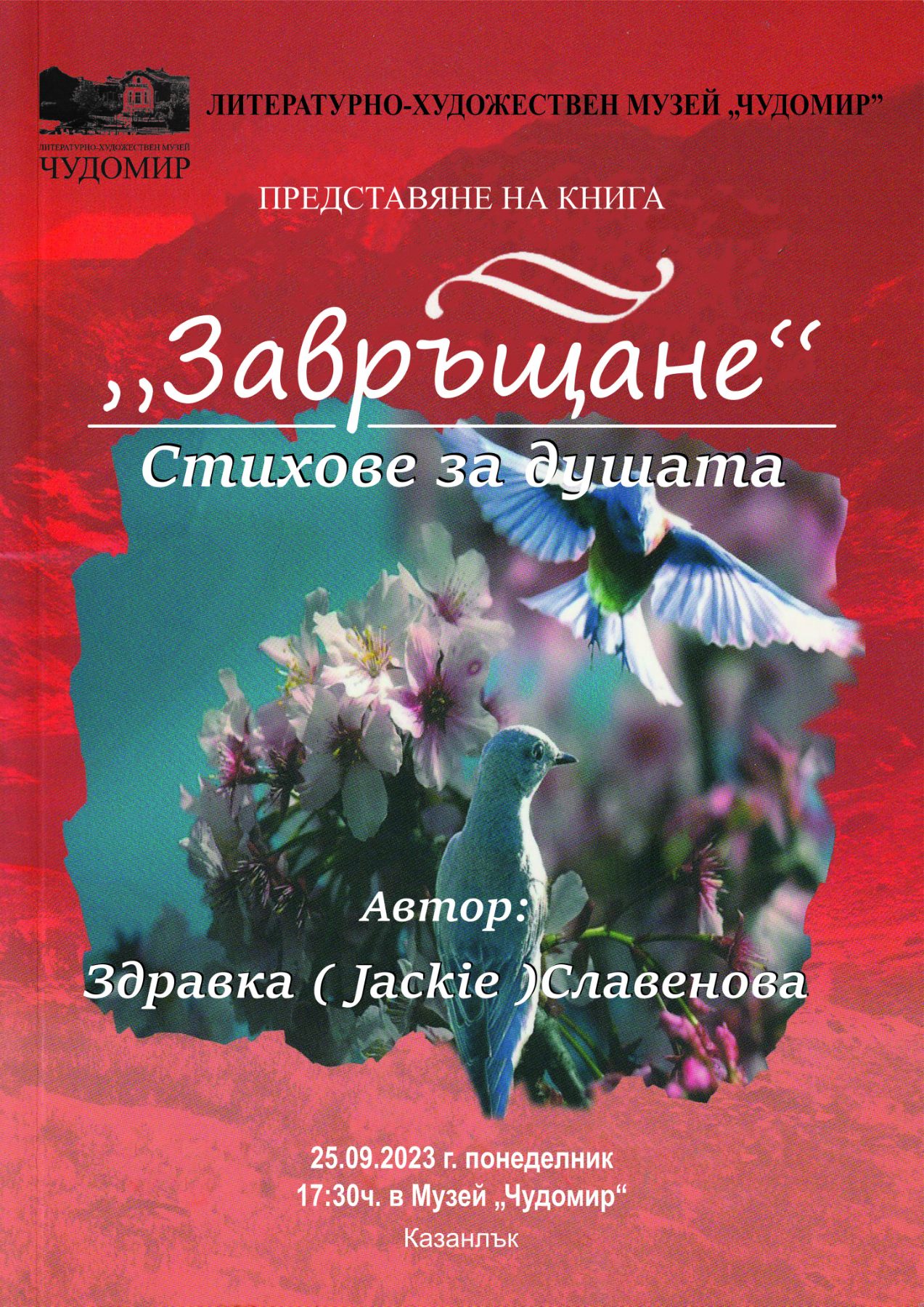 На 25 септември 2023 г. от 17:30 в Музей „Чудомир“ ще се състои премиерата на новата книга „Завръщане“ от поетесата Здравка Славенова.